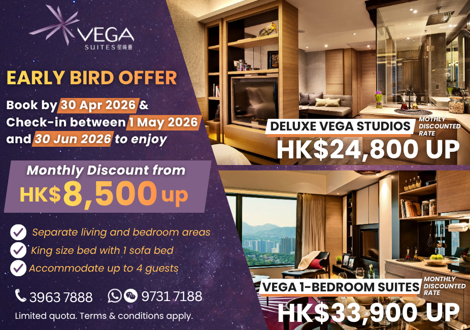 Vega Suites, a stylish hotel that offers serviced suites, redefines contemporary chic and provides a vibrant living experience for those seeking short-term stays in a hotel or long-term stays in serviced apartments. Starting March 1, 2023, Holiday Inn Express Hong Kong Kowloon East, located on the lower floors of Vega Suites, is upgraded and integrated to become part of Vega Suites. This integration marks a new chapter for Vega Suites.
